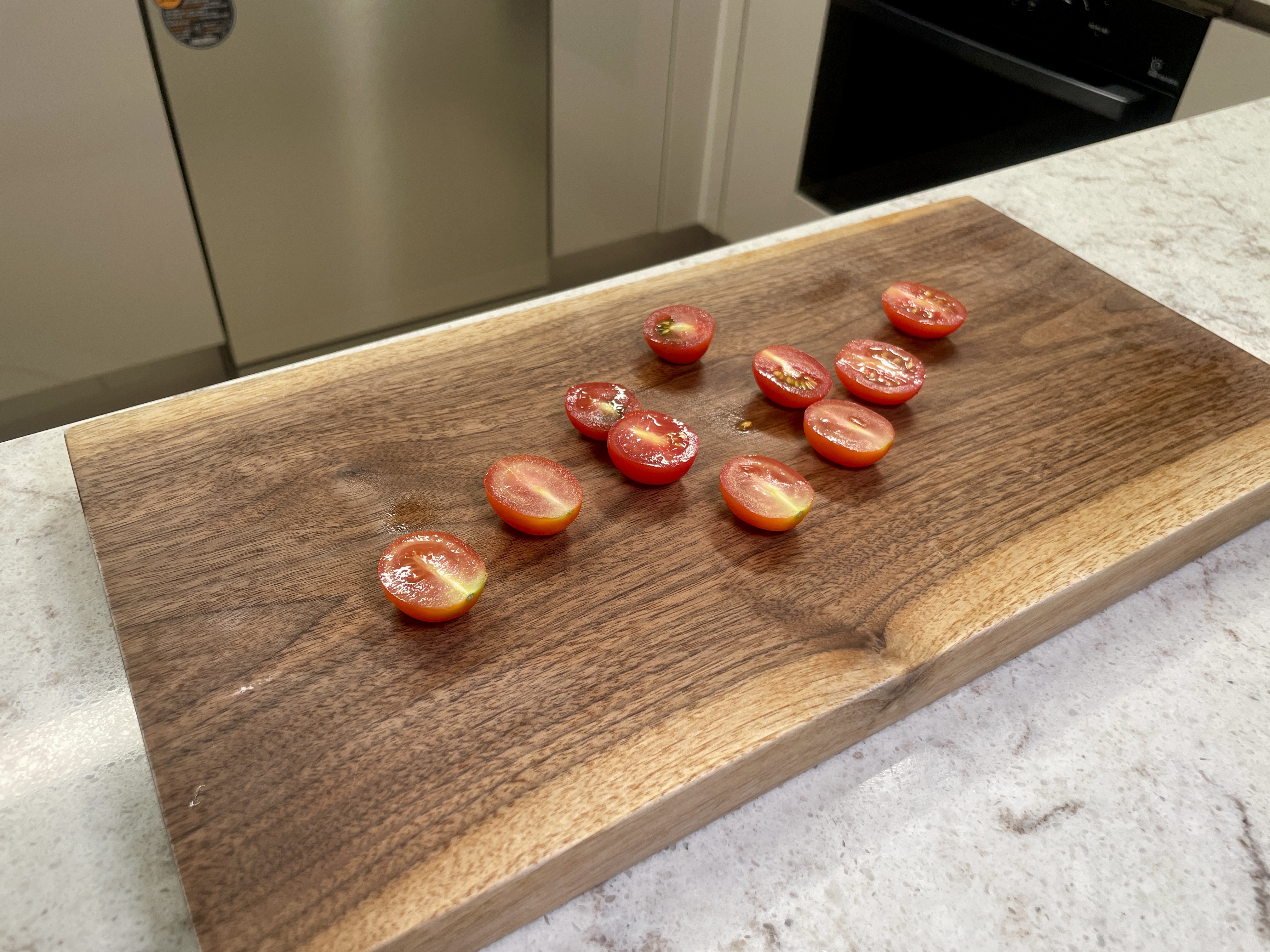 4️⃣ 방울토마토는 반으로 썰고, 드레싱 재료를 모두 섞어 소스를 만들어주세요.