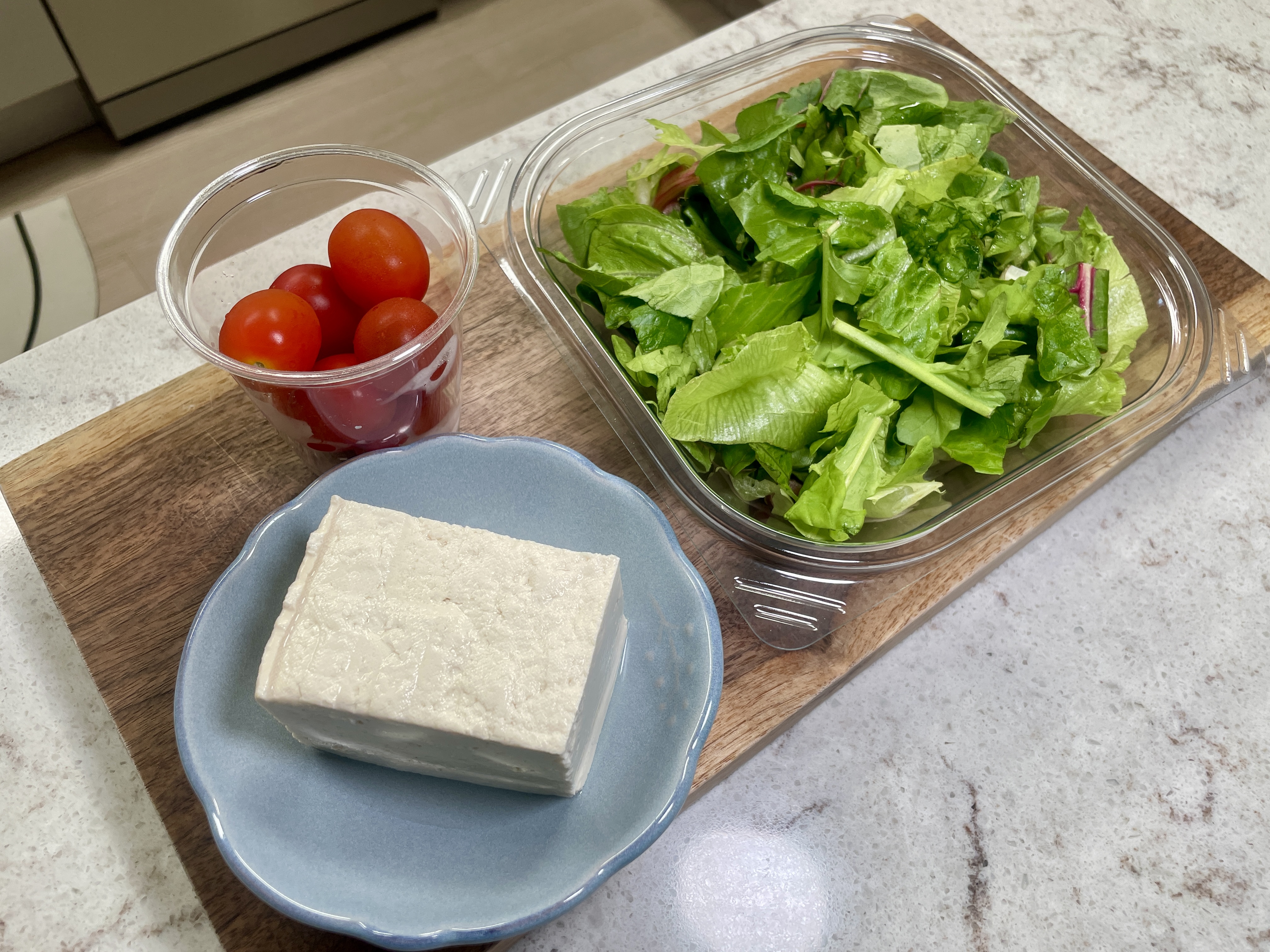 5️⃣ 접시에 채소 → 구운 두부 → 토마토를 올리고
